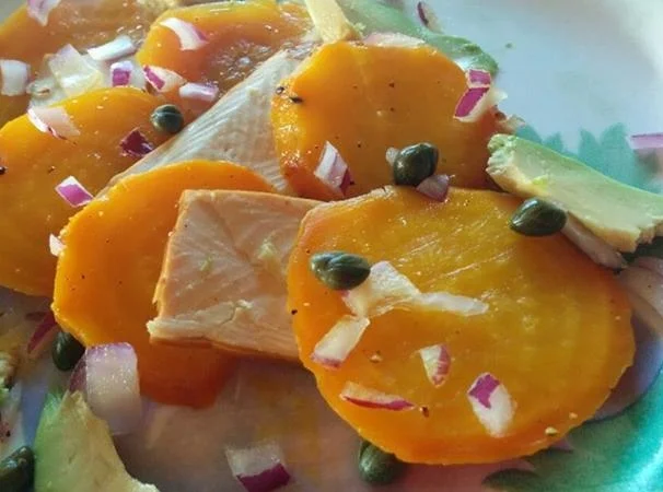 Last night I tried two new recipes from the Vedge cookbook. My first course was a chilled appetizer of Salt-roasted golden beets with smoked tofu, avocado, red onion, capers & cucumber-dill sauce. Playing with the way we often eat smoked salmon, the thinly sliced salt-roasted golden beet is marinated lighty in sherry vinegar & its sweet-salty-sourness was in perfect harmony with the other flavors on the plate. My son, who is the salmon fanatic in our family, commented: "I don't even think I'd like this better with lox!"