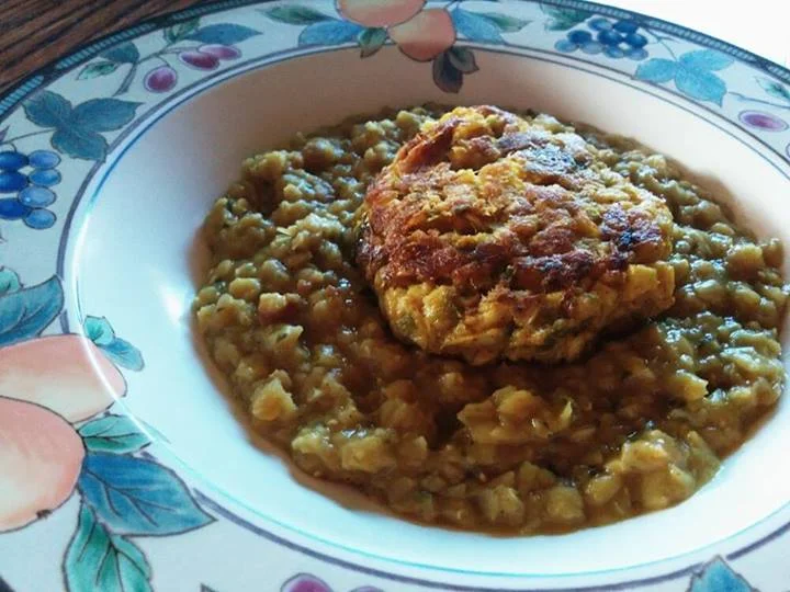 The second course & entree was hearts-of-palm cakes served over curried red lentils. Hearts-of-palm have a similar texture & slightly brighter taste than artichoke hearts. The cakes, made similarly to a crab cake, are also stuffed with scallions & minced bell pepper. Warm, inviting & hearty, at the end of the meal I was found I didn’t miss the meat at all.